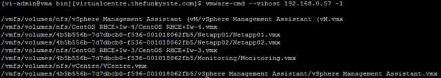 This command can be used to manage virtual machines, as opposed to most of the vicfg-* tools which work on hosts. Typical uses are for registering VMs to vCenter, taking/removing snapshots and forceably shutting down a failed VM. These operations can be performed more easily using PowerCLI, but it all depends on your requirements – vmware-cmd can be used during a scripted install for instance whereas PowerCLI is unavailable.