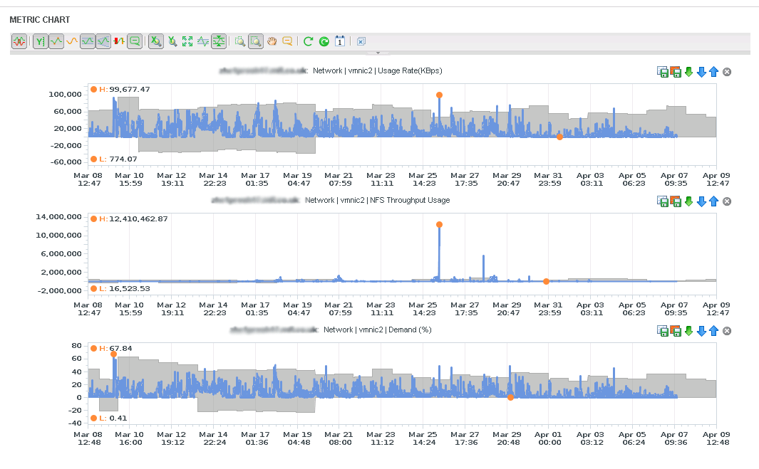 The ‘All Metrics’ view showing multiple graphs for network throughput on a given vmnic